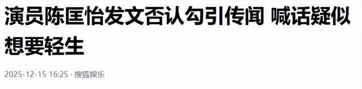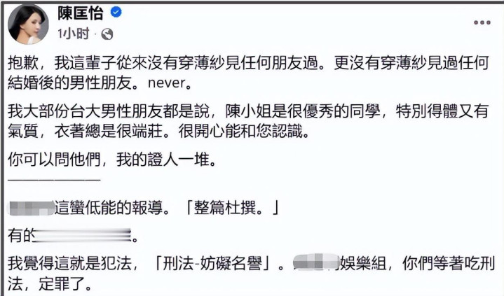 12 月初,陈匡怡在社交媒体上连续发布多篇控诉内容,直指台媒对其私生活的围剿式报道。